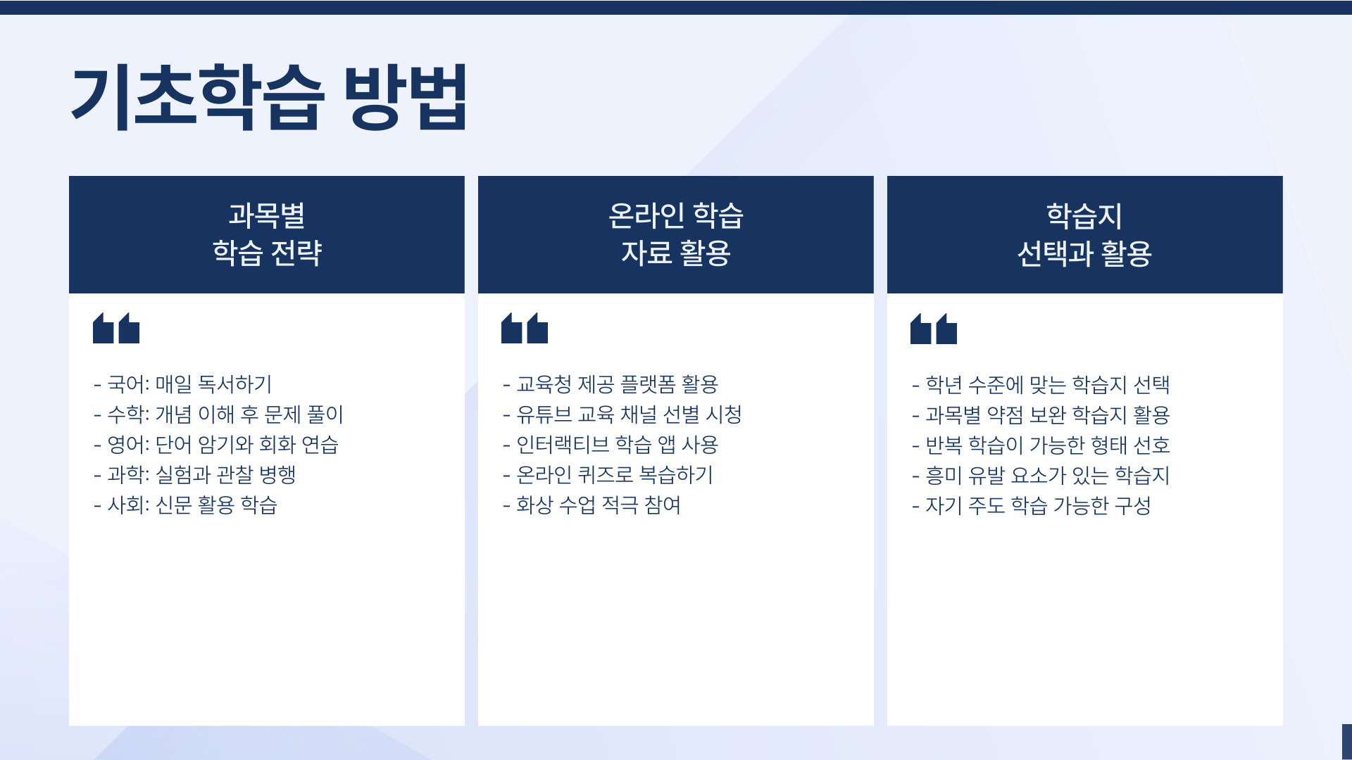 마지막으로, 방학 동안 자기주도 학습을 유도하는 것이 중요합니다. 아이가 스스로 학습 목표를 설정하고 이를 달성하기 위해 노력하는 과정은 매우 의미 있는 경험이 될 수 있습니다. 아이에게 목표를 세우고, 그에 맞춰 학습할 수 있도록 도와주세요.