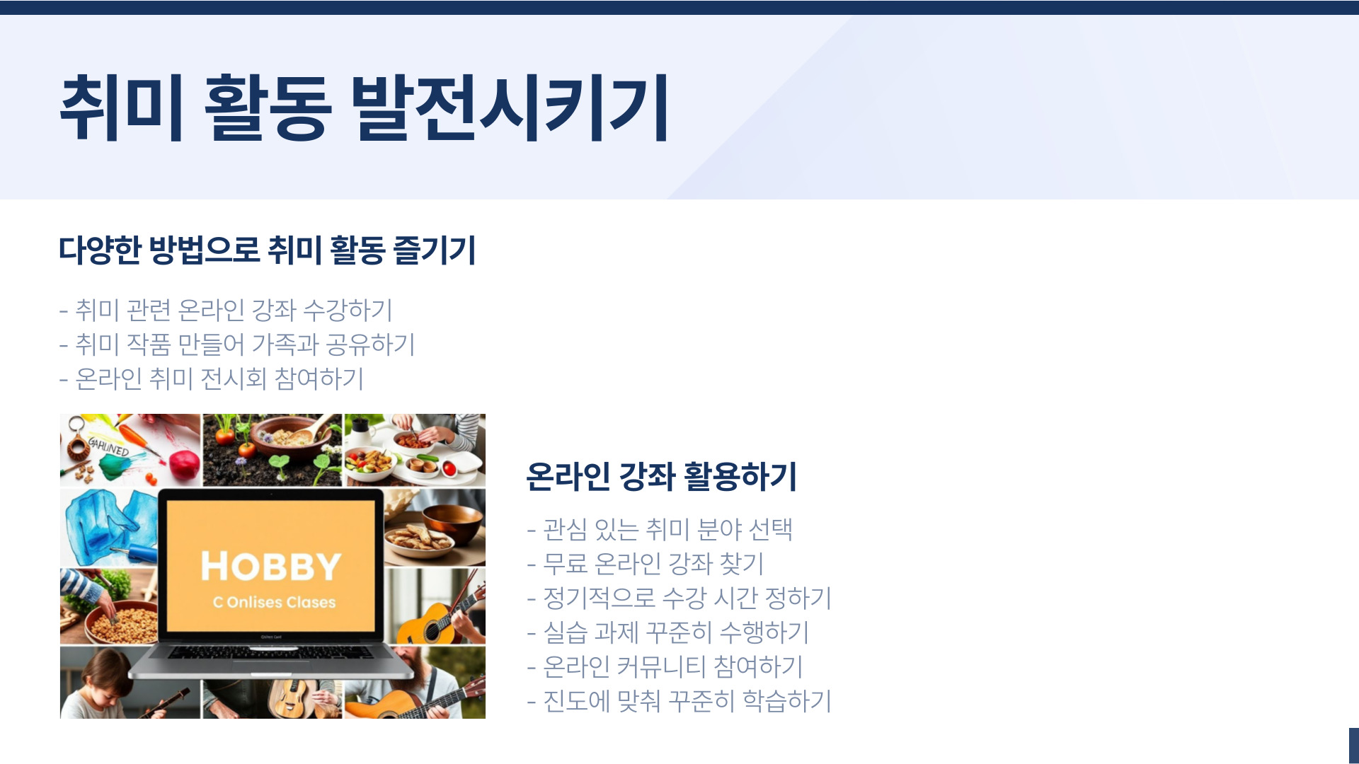 특히 요즘은 온라인으로 다양한 강의를 들을 수 있으니, 아이가 좋아하는 주제를 선택하여 강의를 들으세요. 이런 행동은 아이의 자기주도 학습 능력을 높이는 데 큰 도움이 됩니다. 직접 요리를 해보거나, 미술품을 만드는 등 실습 위주의 활동이 매우 효과적입니다.