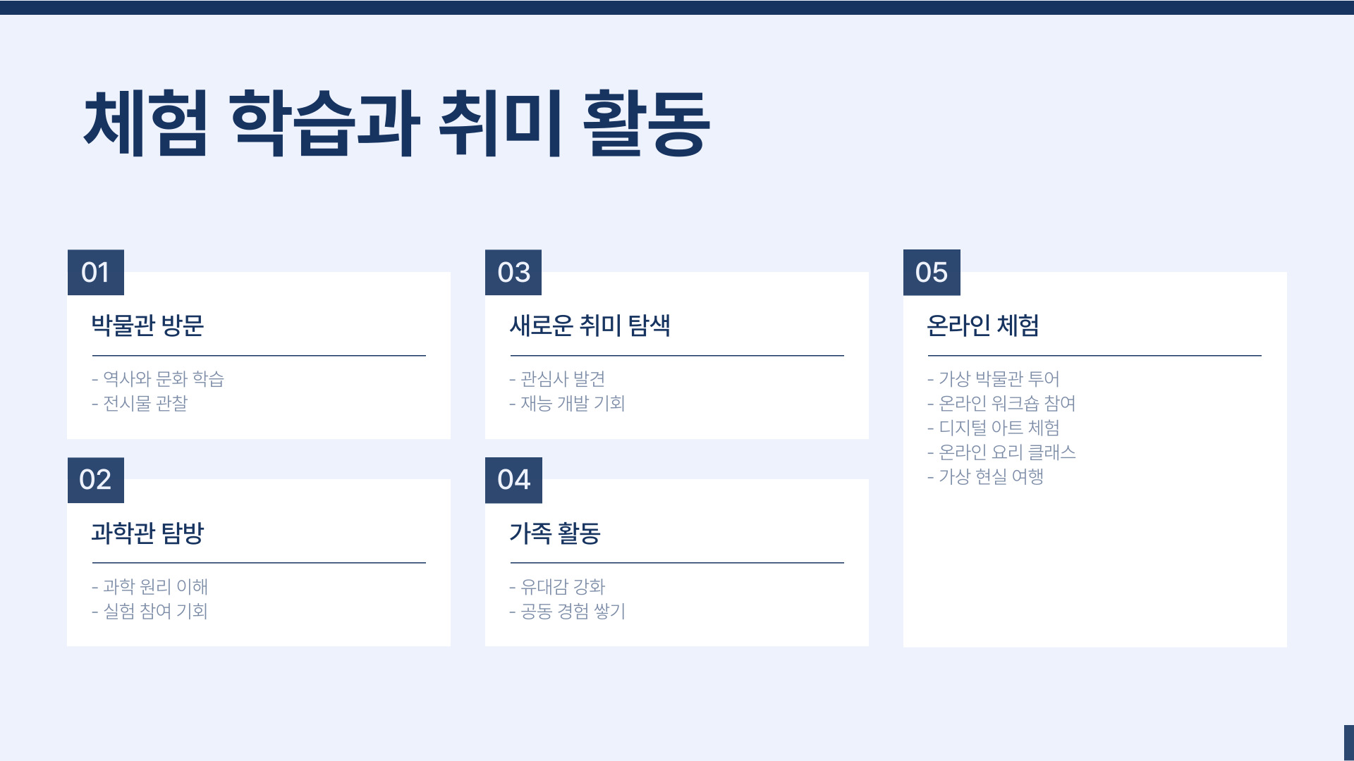 - 미술, 음악, 과학 등 다양한 활동 시도하기