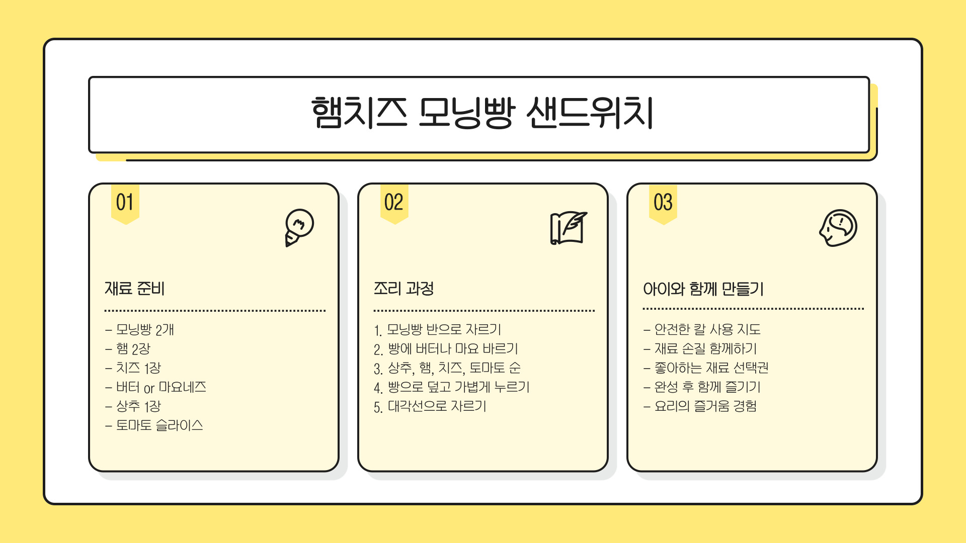 두 번째 메뉴는 치즈 토스트입니다. 아이들이 좋아하는 치즈를 활용한 간편한 메뉴로, 준비하기도 쉽고 맛도 뛰어납니다.