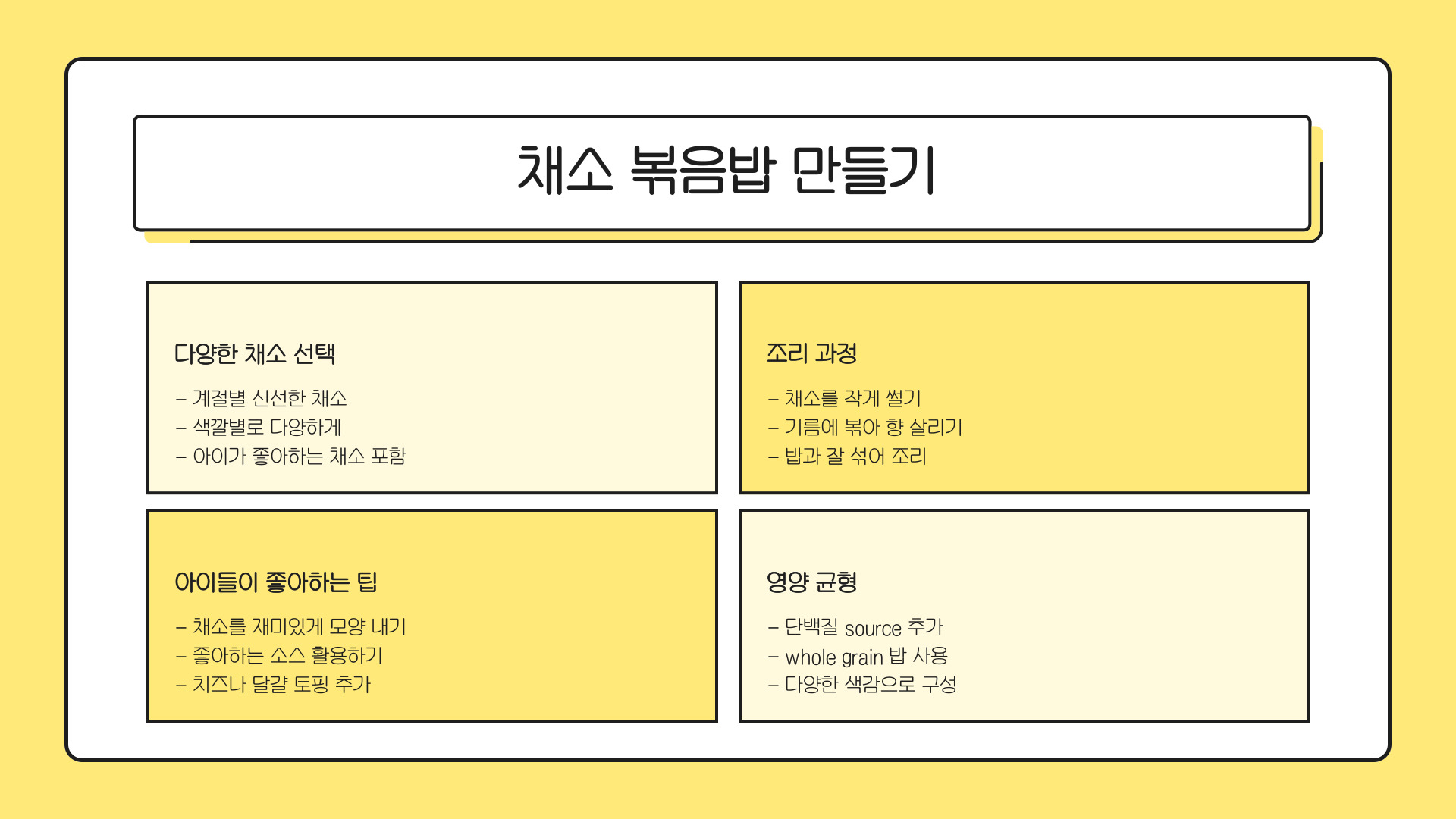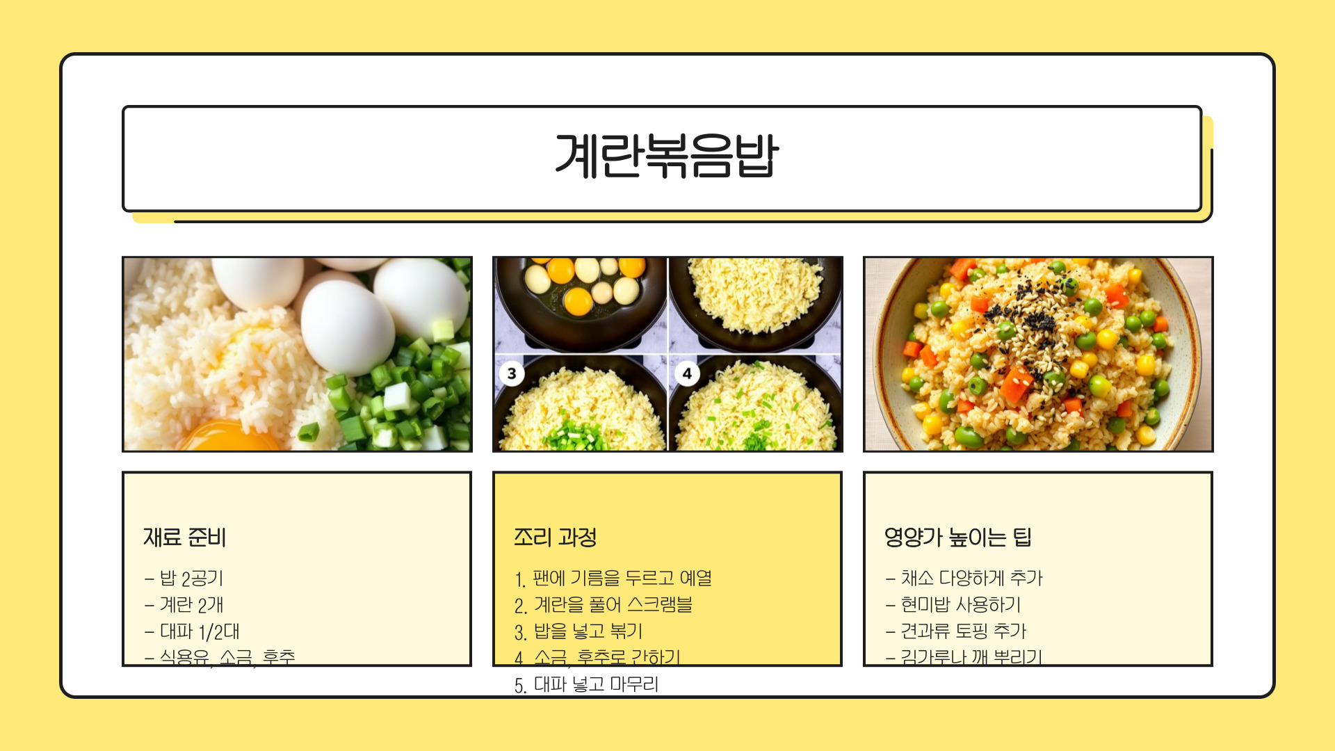 볶음밥은 아이들이 좋아하는 메뉴 중 하나로, 다양한 야채를 섞어 영양을 보충할 수 있는 좋은 방법입니다. 특히 남은 밥을 활용할 수 있어 경제적이기도 합니다.