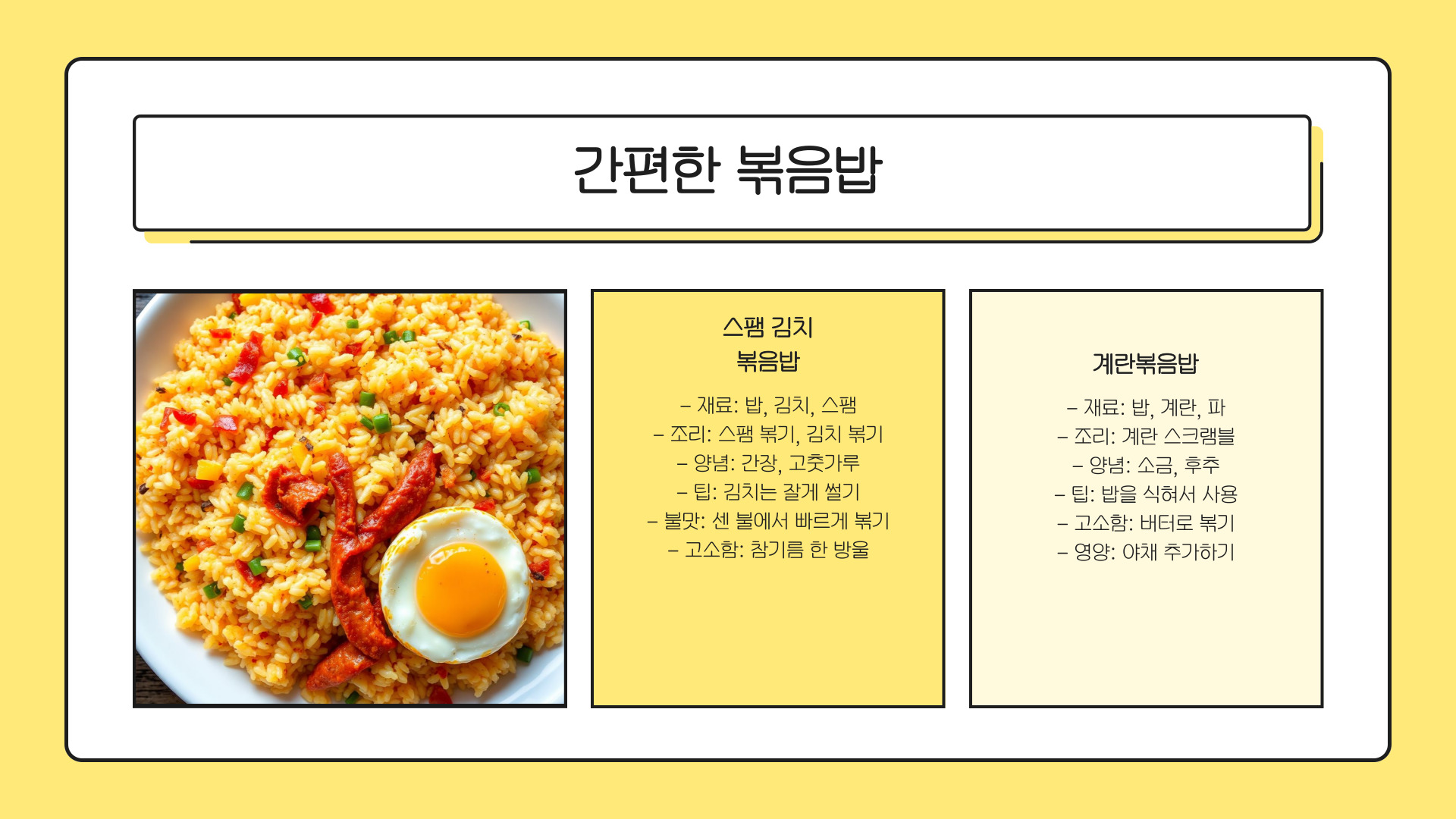 재료로는 남은 밥, 당근, 피망, 양파, 그리고 간장 등을 사용할 수 있습니다. 먼저 팬에 기름을 두르고 야채를 볶은 후, 남은 밥을 넣고 함께 볶아줍니다. 마지막에 간장으로 간을 맞추면 완성입니다.