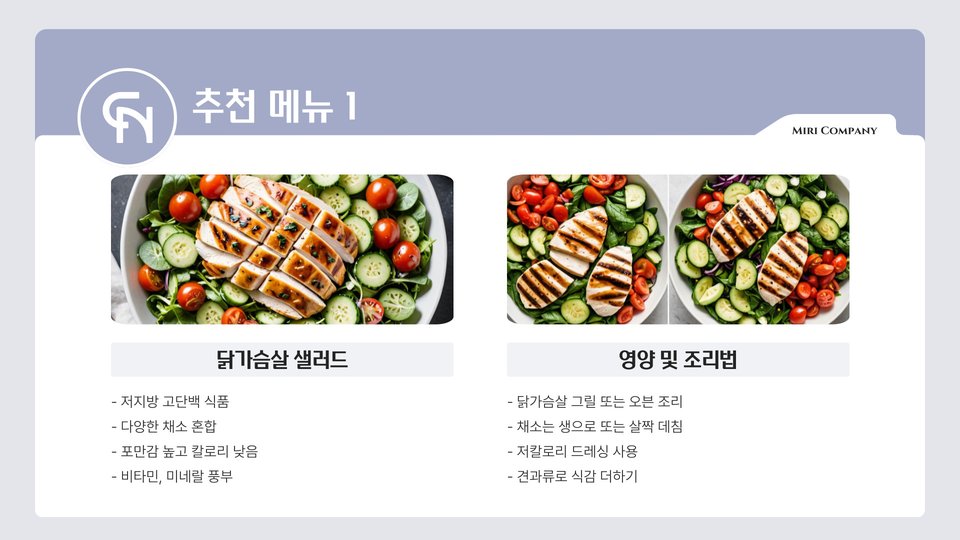 - 닭가슴살 샐러드는 저칼로리, 고단백으로 다이어트에 좋음