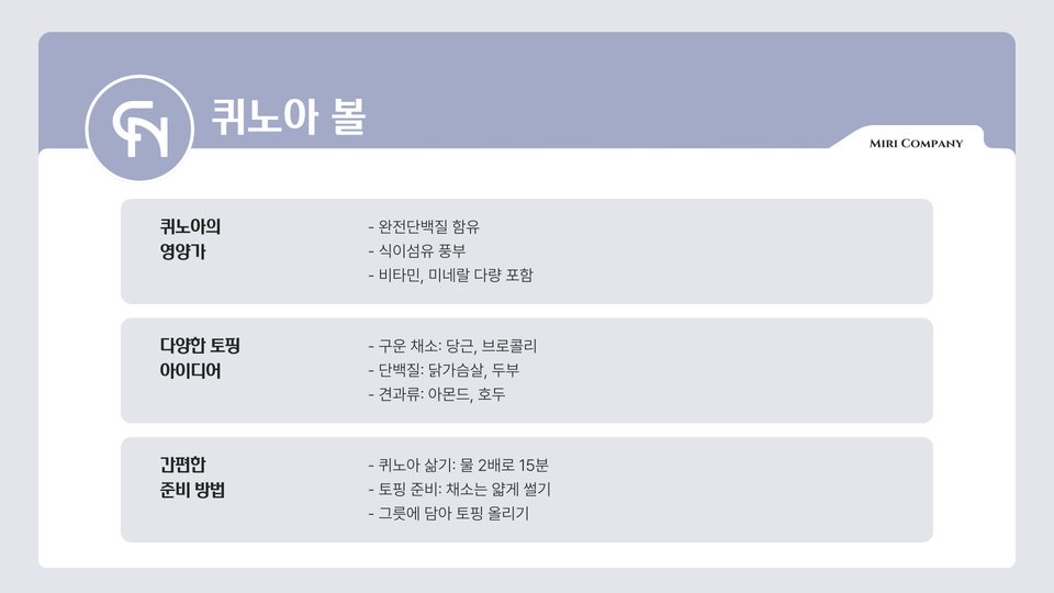 퀴노아 볼은 간편하게 만들 수 있고, 식사 대용으로도 적합합니다. 다양한 채소를 추가하여 영양을 더할 수 있습니다.