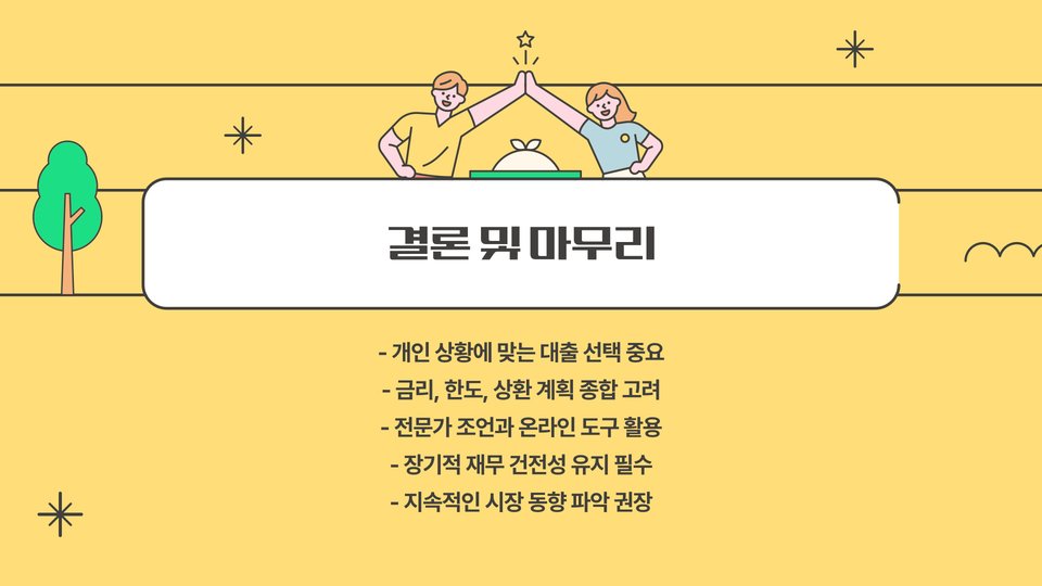 - 온라인 비교 도구를 활용하여 최적의 대출 상품을 찾는 것이 유리합니다.