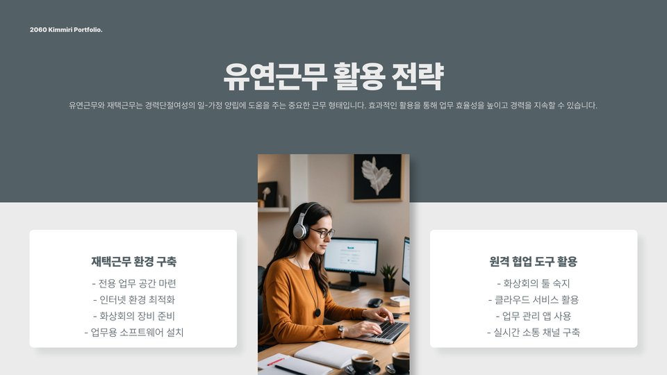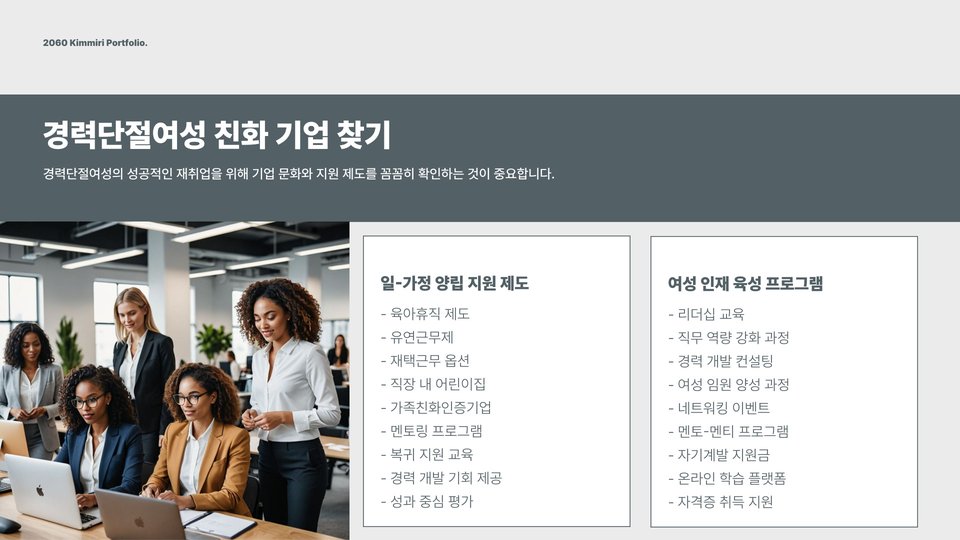 둘째, 유연한 근무 방식에 대한 이해가 중요합니다. 코로나19 이후 많은 기업이 원격 근무와 같은 유연한 근무 형태를 도입하고 있습니다. 이러한 변화는 경력단절여성에게는 더 많은 취업 기회를 제공할 수 있습니다. 재택 근무나 파트타임 근무를 통해 가정과 직장을 병행할 수 있는 환경이 조성되고 있습니다.
