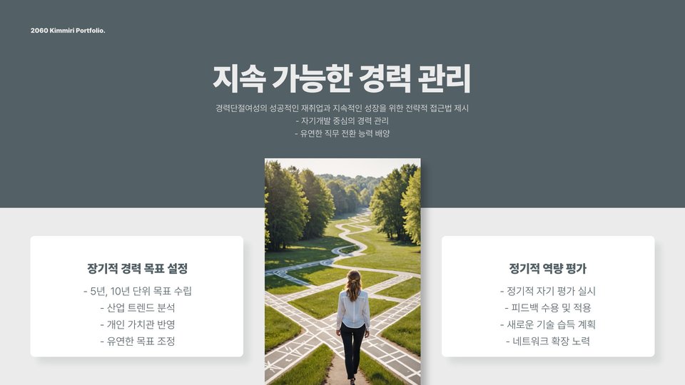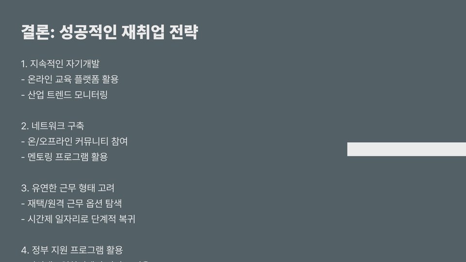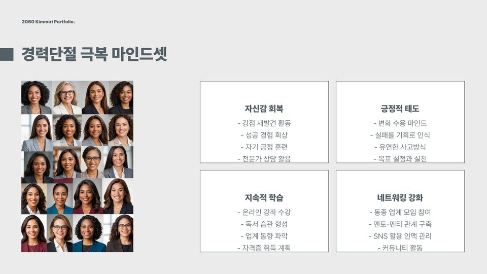 마지막으로, 취업 준비 과정에서 정신적 준비와 자아 존중감이 매우 중요합니다. 경력단절로 인해 자신감을 잃은 경우가 많지만, 긍정적인 마인드를 유지하는 것이 필요합니다. 자신이 가진 경험과 능력을 믿고, 작은 성공을 축하하는 것이 필요합니다. 또한, 주변의 지지와 격려가 큰 힘이 될 수 있습니다.