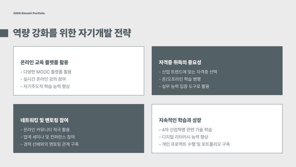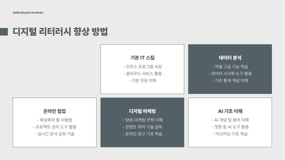 첫째, 디지털 기술을 강화하는 것이 필수적입니다. 현재 대부분의 기업이 디지털 전환을 진행 중이며, 이에 따라 IT 관련 기술과 소프트웨어 사용 능력은 큰 장점이 됩니다. 예를 들어, 엑셀, 파워포인트, 데이터 분석 툴 등의 활용 능력을 키우는 것이 중요합니다. 온라인 교육 플랫폼을 통해 이러한 기술들을 쉽게 배울 수 있으며, 자격증 취득 후 이력을 채우는 것도 좋은 방법입니다.