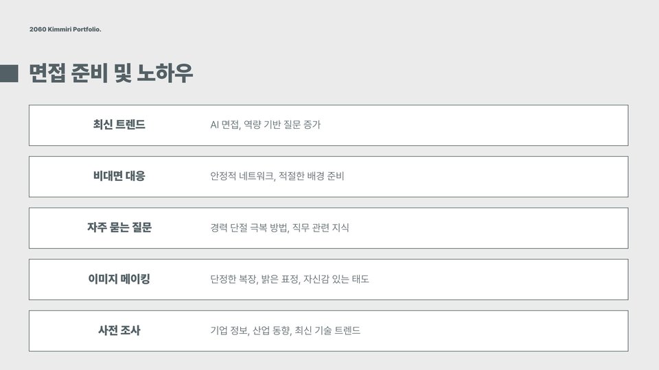 면접에서는 적극적인 태도와 자신감을 보여주어야 합니다. 필요한 경우, 실제 면접 연습을 통해 자신의 강점과 약점을 파악하고, 유사한 질문에 대한 답변을 미리 준비하면 좋습니다. 긍정적인 마인드를 유지하고 모든 상황을 기회로 바꾸려는 노력이 필요합니다.
