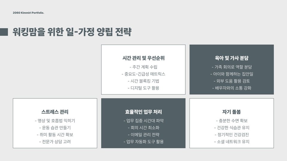 - 유연한 근무 형태에 대한 이해를 넓히고 활용한다.