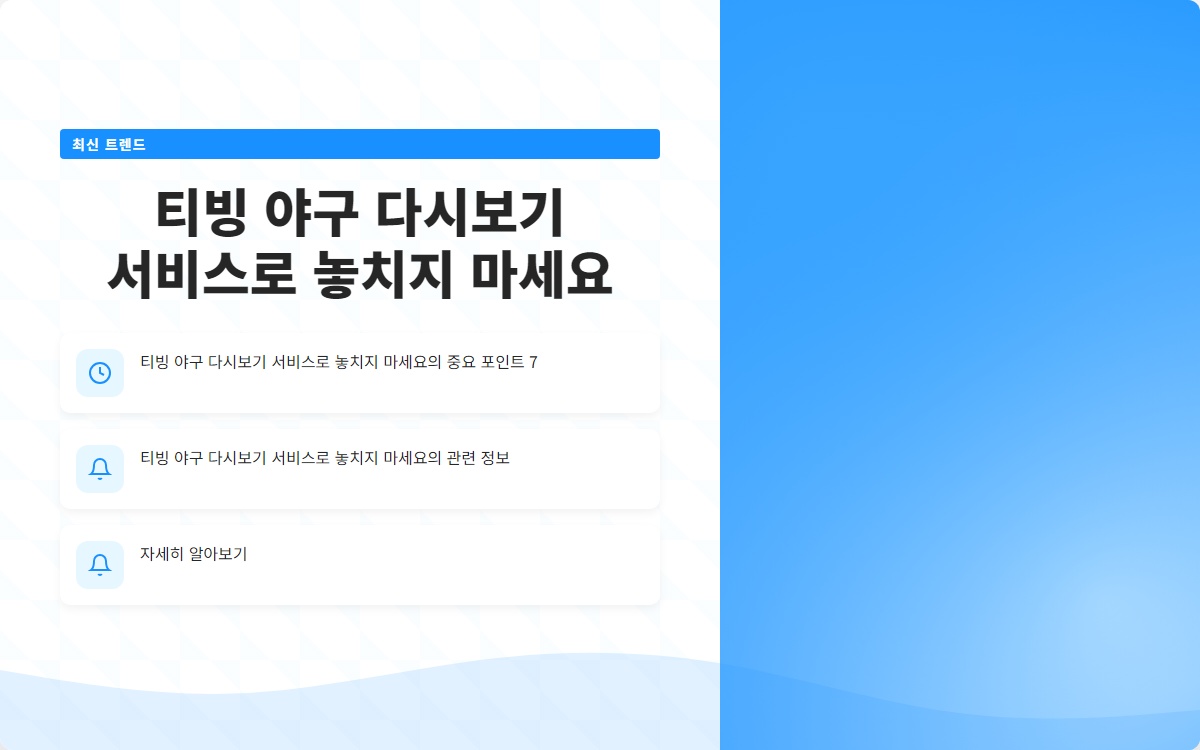 야구 팬이라면 놓칠 수 없는 순간들이 많습니다. 특히 가을야구 시즌은 그 어느 때보다도 긴장감 넘치는 경기들이 펼쳐지는데요, 원하는 경기를 놓쳤다면 얼마나 아쉬울까요? 이제는 그런 걱정 없이 티빙에서 야구 다시보기 서비스를 통해 모든 경기를 다시 관람할 수 있습니다. 궁금하시죠?