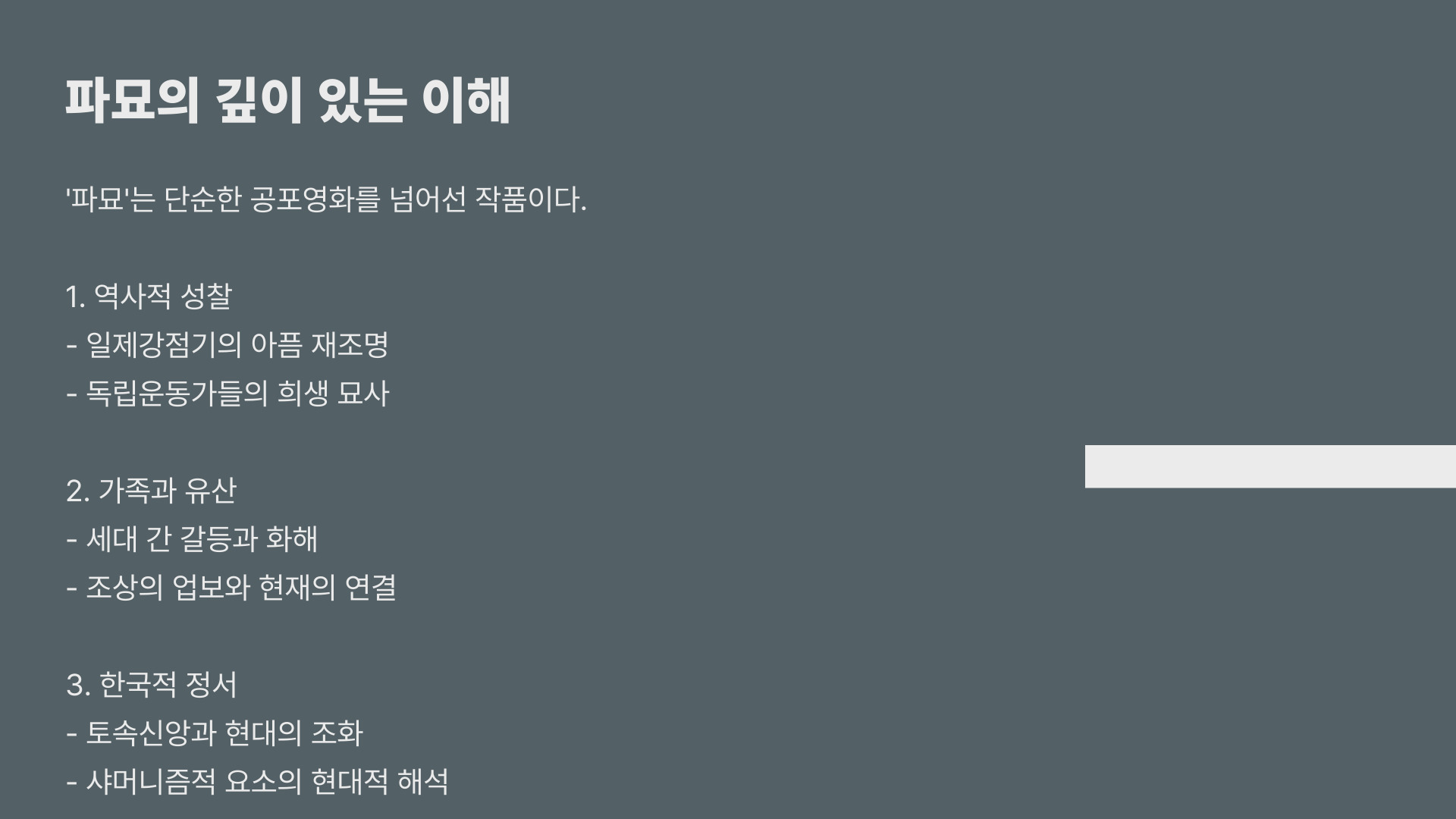 따라서, 파묘 해석은 단순한 의례가 아니라, 가족의 역사와 가치를 이해하고 존중하는 과정이라고 할 수 있습니다.