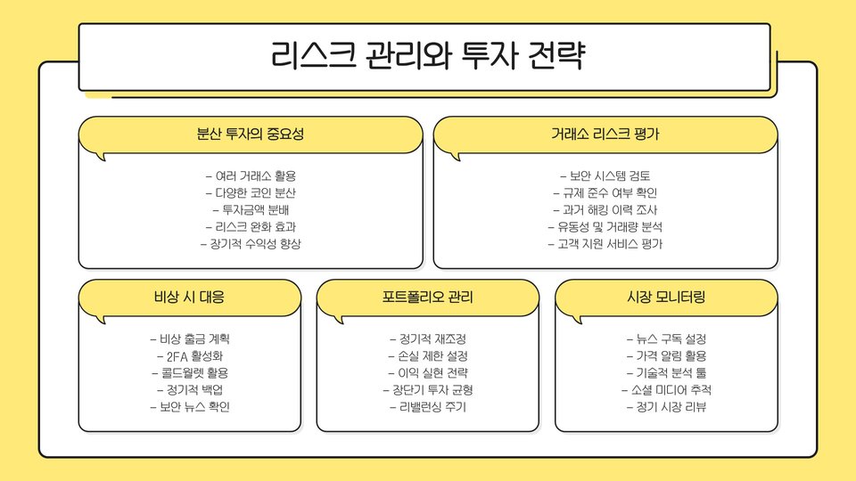 또한, 거래소에서 제공하는 지갑서비스를 활용하는 것도 좋은 방법입니다. 특히, 탈중앙화 지갑을 사용하면 자산을 보다 안전하게 보호할 수 있습니다. 자신이 거래하는 암호화폐의 최근 동향도 항상 체크해야 하며, 시장의 변동성이 큰 만큼 선제적으로 대응할 수 있는 능력을 기르는 것이 중요합니다.