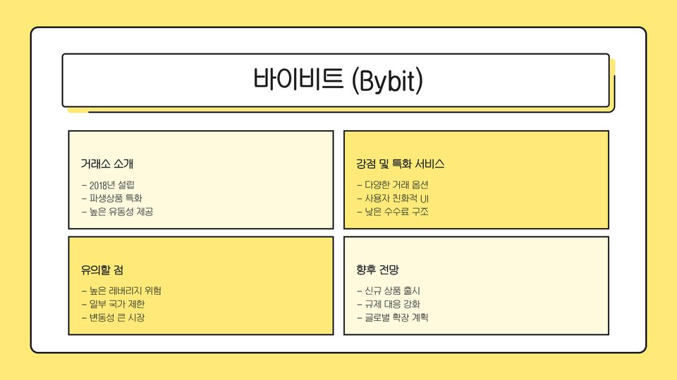 이와 함께, 바이빗(Bybit), Huobi, 빗썸(Bithumb), 그리고 코인제스트(Coincheck)와 같은 거래소도 각각의 장점이 있어, 자신의 투자 성향에 맞는 선택이 중요합니다.