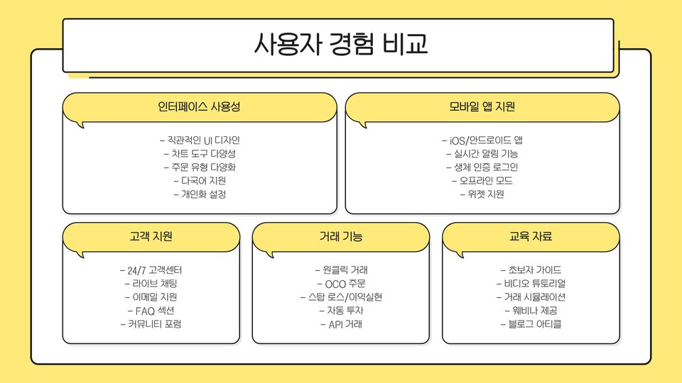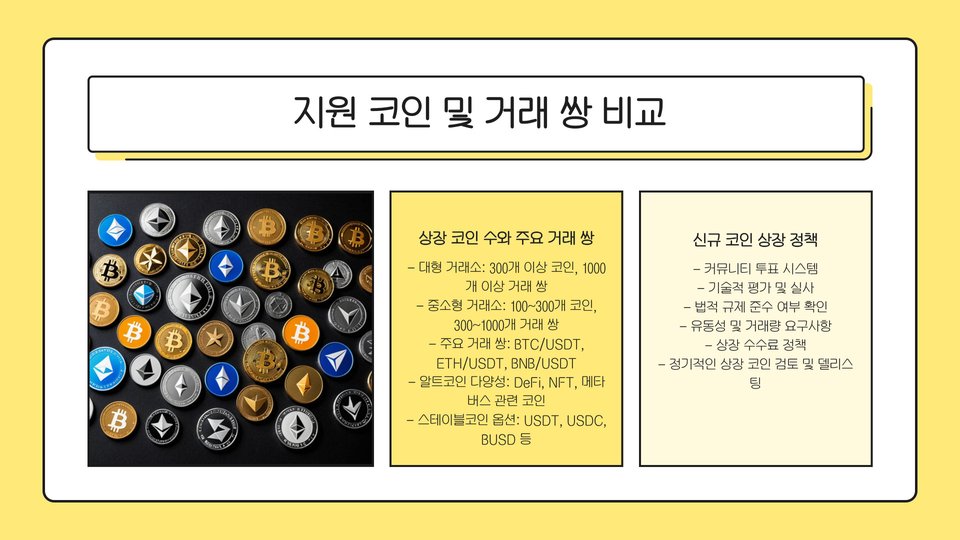 세 번째로 중요한 요소는 거래 가능한 암호화폐 종류입니다. 모든 거래소가 동일한 암호화폐를 지원하지 않기 때문에, 투자하고자 하는 코인이 해당 거래소에서 거래 가능한지 확인해야 합니다. 마지막으로, 고객 지원 서비스도 선택의 중요한 요소입니다. 적절한 고객 지원이 없다면, 문제가 발생했을 때 빠르게 해결할 수 없기 때문입니다.