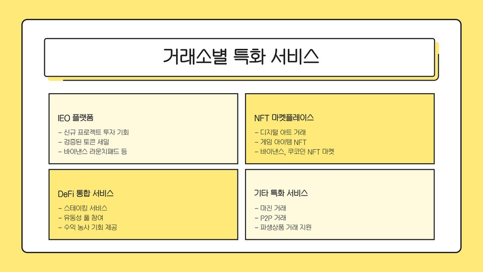 | Binance | 다양한 암호화폐, 낮은 수수료 |