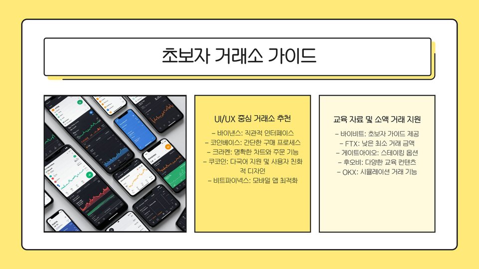 다음은 코인베이스(Coinbase)입니다. 초보자들이 사용하기 쉬운 인터페이스를 제공해, 암호화폐 거래를 처음 시작하는 사람들에게 매우 유용합니다. 이 외에도 크라켄(Kraken), 비트파이넥스(Bitfinex), OKEx 등도 높은 보안과 다양한 기능을 제공하여 많은 사용자에게 사랑받고 있습니다.