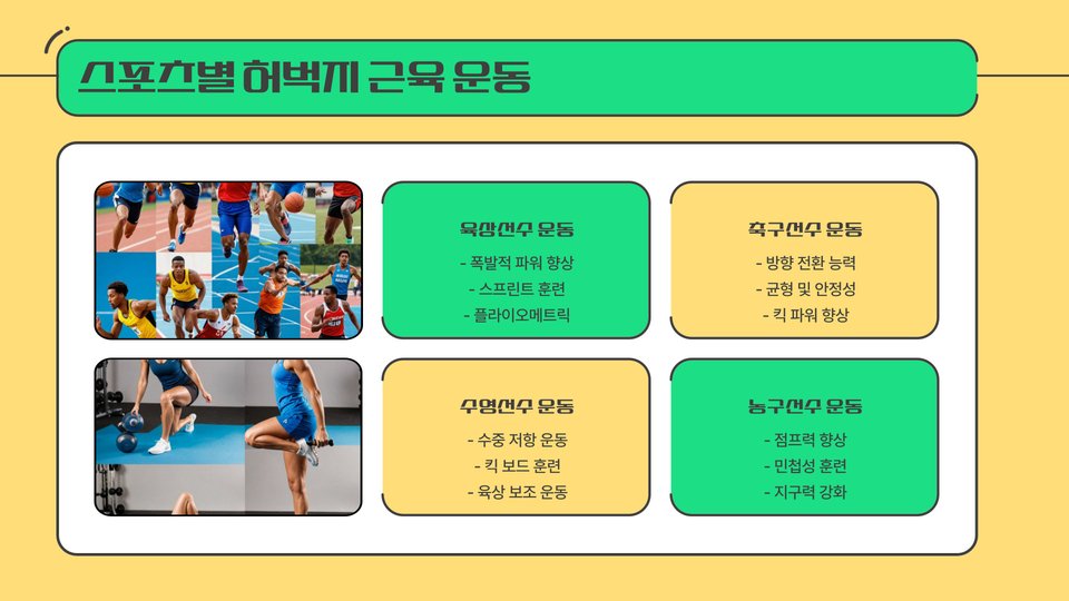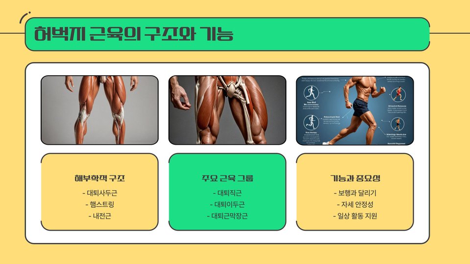 허벅지 근육은 대퇴사두근, 햄스트링, 내전근 등으로 구성되어 있으며, 이들은 각각 신체의 다양한 움직임에 기여합니다. 이러한 근육들은 걷기, 뛰기, 앉기와 같은 기본적인 동작뿐만 아니라, 운동 선수에게는 필수적인 근력과 지구력을 제공합니다. 특히, 강한 허벅지 근육은 부상을 예방하고, 스프린트나 점프와 같은 고강도 운동을 수행하는 데 도움을 줍니다.