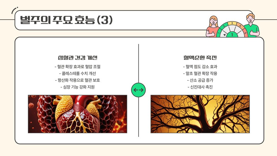 벌주는 특히 소화 개선에 효과적입니다. 발효 과정에서 생성되는 유익한 유산균이 소화를 돕고 장 건강을 유지하는 데 큰 역할을 합니다. 또한, 벌주는 비타민 B 복합체, 비타민 C, 안티옥시던트 등의 함량이 높아 면역력을 강화해주는 효과도 있습니다.