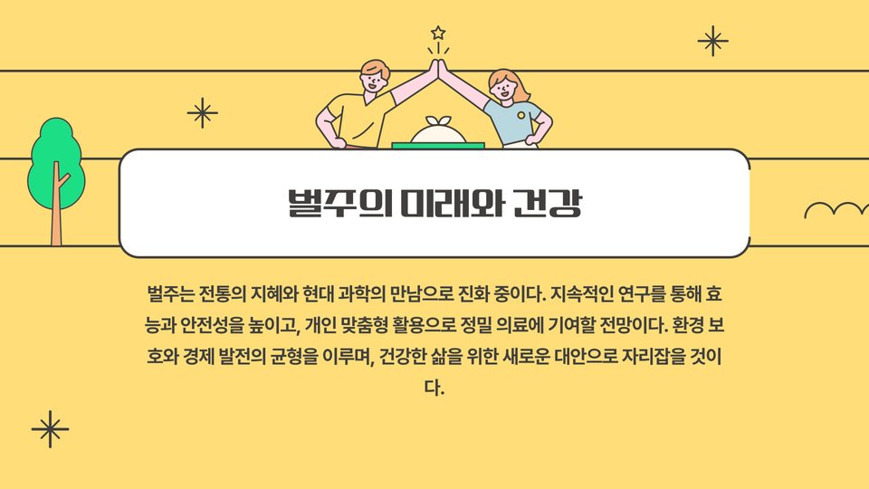 2025년을 맞이하여 벌주의 효능에 대해 알아보았습니다. 벌주는 자연이 주는 소중한 선물입니다. 건강을 유지하고, 활기찬 삶을 살기 위해 벌주를 적극 활용해보세요. 여러분의 건강한 삶에 벌주가 큰 도움이 되길 바랍니다.