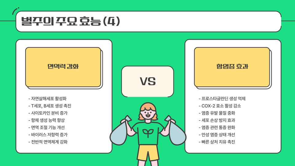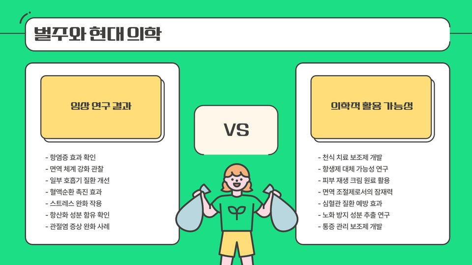 둘째, 항염증 효과입니다. 벌주에서 발견되는 성분은 염증을 감소시키는 데 도움을 줄 수 있습니다. 이로 인해 관절염과 같은 만성 질환의 증상을 완화하는 데 유효하다는 연구 결과도 있습니다.