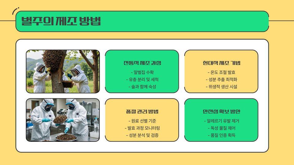 벌주는 벌들이 수집한 꿀을 발효시켜 만들어진 음료입니다. 이 과정에서 꿀이 발효되면서 발효산, 비타민, 아미노산 등 다양한 영양소가 생성됩니다. 벌주는 알코올이 포함되어 있다 보니 전통적인 발효주와 비슷한 성격을 가집니다.