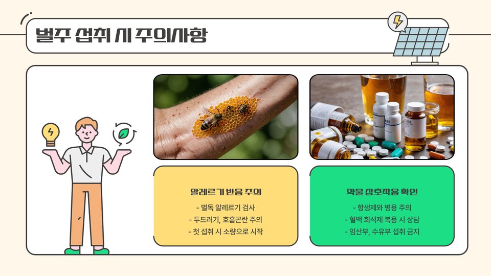 벌주를 섭취할 때는 몇 가지 주의사항이 필요합니다. 첫째, 알레르기 반응입니다. 일부 사람들은 벌에서 유래하는 성분에 알레르기를 가지고 있을 수 있으므로 처음 섭취할 때는 소량으로 시작하는 것이 좋습니다.