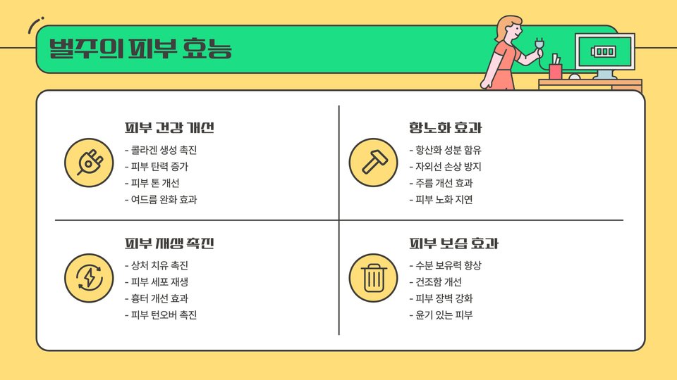 마지막으로 피부 개선에 대한 효과입니다. 벌주에 포함된 항산화 성분은 피부 노화를 방지하고, 피부를 건강하게 유지하는 데 도움을 줍니다. 자연스럽게 피부 톤을 개선하고, 여드름에도 효과적입니다.