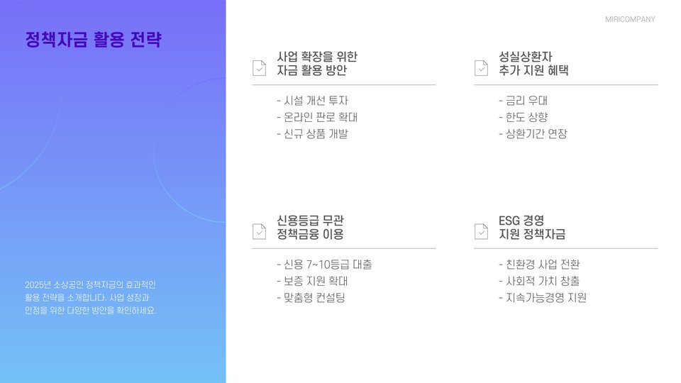 소상공인사업자대출은 작은 기업이 성장하기 위한 중요한 기회를 제공합니다. 2025년에 더 나은 대출 상품을 활용하기 위해서는 객관적인 정보와 전문가의 조언을 바탕으로 다양한 선택지를 탐색해야 합니다. 신중하게 준비하고 모든 정보를 고려하며 대출을 신청한다면, 귀하의 사업은 한층 더 발전할 것입니다.