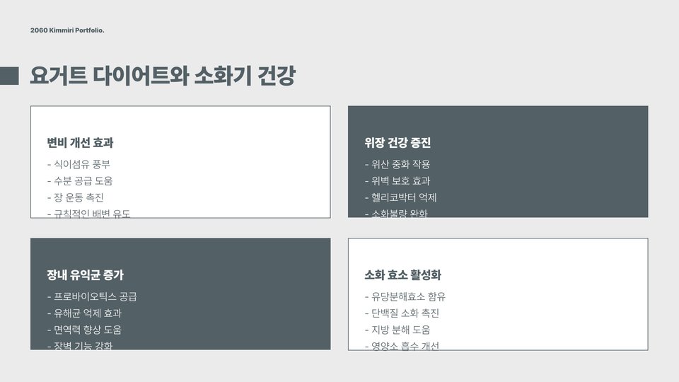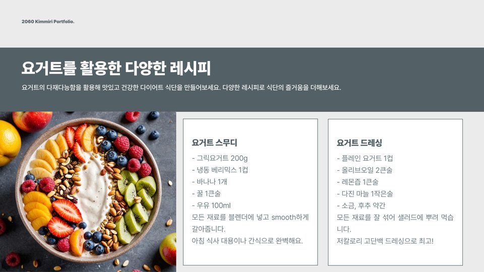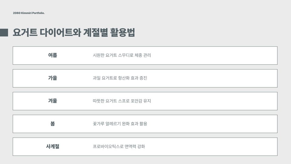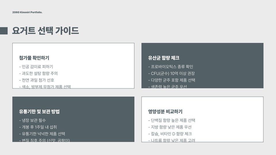 | 첨가물 체크 | 설탕과 인공 재료가 들어간 요거트는 피하고, 자연 요거트를 선택하세요. |