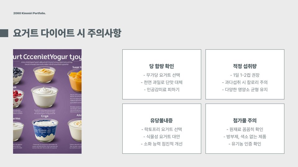 | 과도한 섭취 금지 | 요거트는 건강하지만, 한 번에 많은 양을 먹지 않도록 주의하세요. |