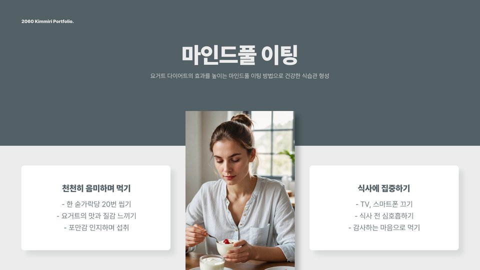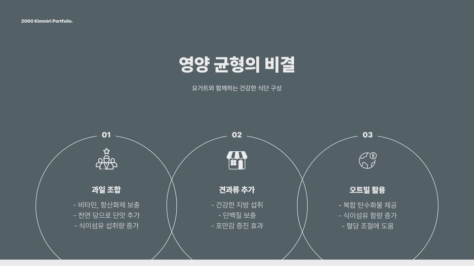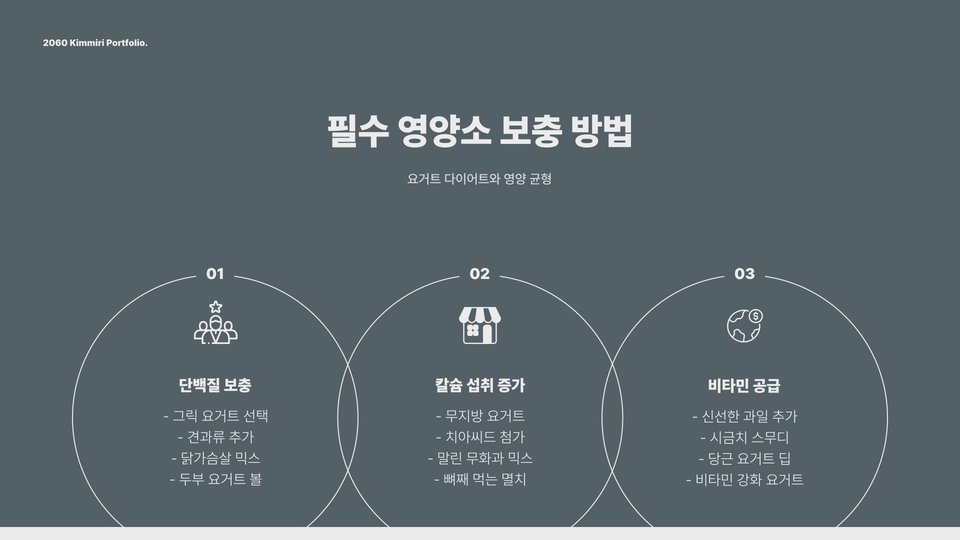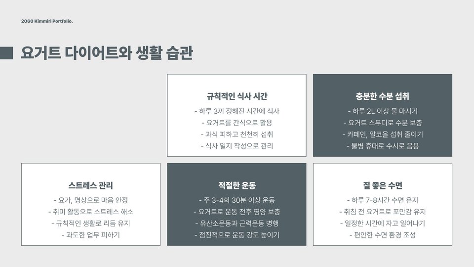 | 균형 잡힌 식사 | 요거트 외에도 다양한 음식을 섭취하여 영양 균형을 맞추세요. |