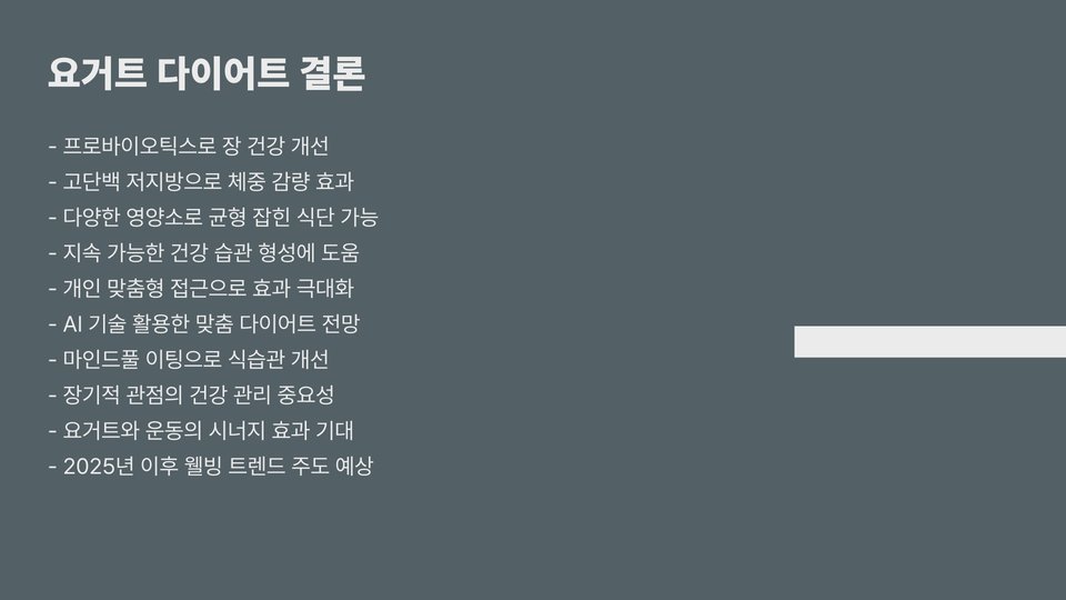 결론적으로, 2025년의 트렌드인 요거트 다이어트는 건강과 체중 관리를 동시에 해결할 수 있는 효과적인 방법입니다. 요거트를 적절히 활용하고, 자신의 몸에 맞는 방법을 찾아 지속 가능한 식습관을 유지한다면, 건강한 미래를 맞이할 수 있을 것입니다.