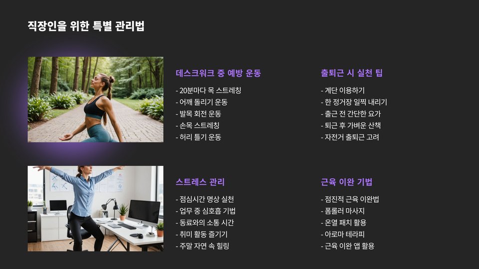 - 요가와 필라테스 같은 유연성 강화 운동도 효과적입니다.