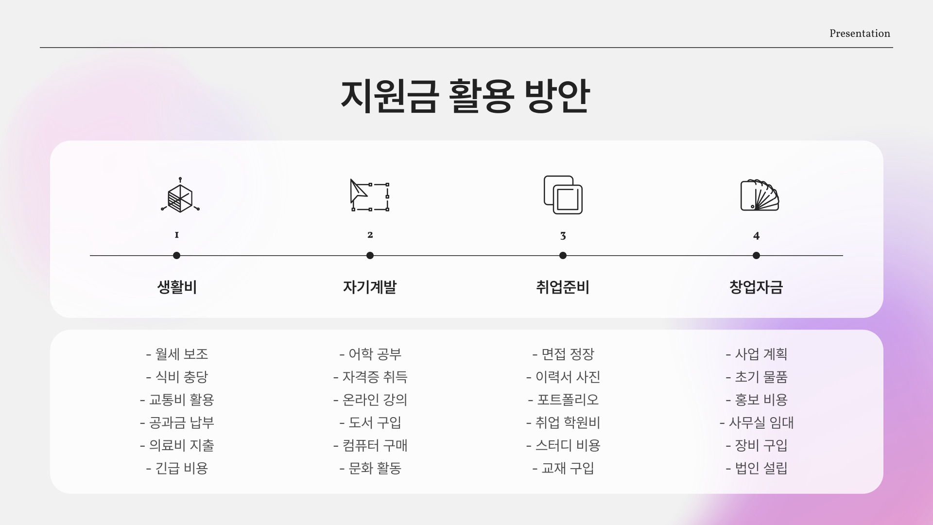 지원금의 주된 목적은 주거비, 교육비 및 생활비 지출을 줄이는 것입니다. 특히, 주거비 부담을 줄이기 위한 임대료 지불에 적극 활용할 수 있습니다. 향후 자산 형성을 고려하여 저축을 통한 재투자도 좋은 방안이 될 수 있습니다.