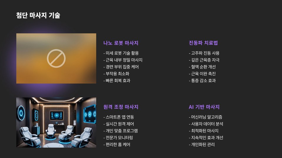 - 근육 마사지는 긴장을 완화하고 혈액순환을 돕습니다.