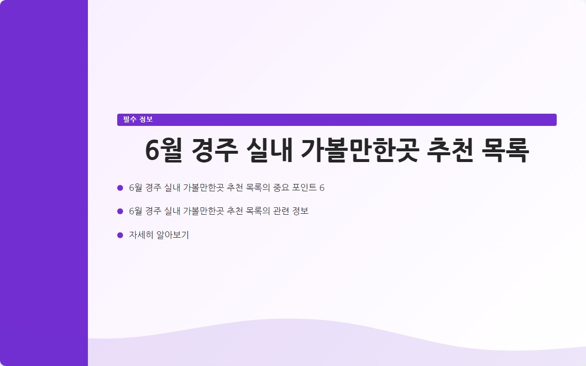 6월 경주에서 가볼 만한 실내 공간을 정리해보면 다음과 같습니다: - 경주엑스포대공원: 다양한 놀이기구와 프로그램 제공 - 자연사박물관: 교육적이고 흥미로운 전시 - 화랑아 놀자: 안전한 실내 놀이터 이러한 장소들을 활용하여 아이와 함께 즐거운 시간을 보내시길 바랍니다! 댓글로 여러분의 경험을 공유해보세요.