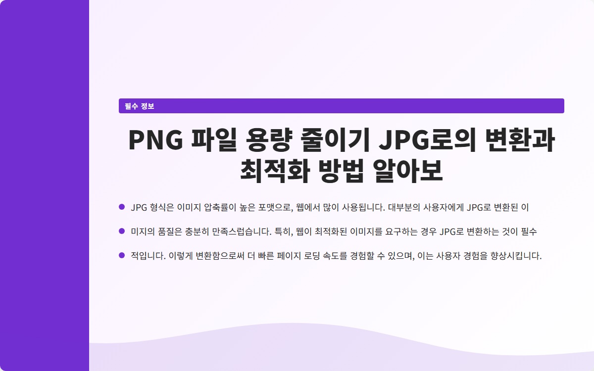 PNG 파일을 JPG 형식으로 변환하는 것은 이미지 용량을 효과적으로 줄이는 좋은 방법입니다. 이를 통해 웹사이트의 로딩 속도를 개선하고, 사용자 경험을 향상시킬 수 있습니다. 단, 변환 시 이미지 품질이 저하될 수 있으므로 주의가 필요합니다. 따라서 변환 과정에서의 설정에 신경을 써야 합니다.