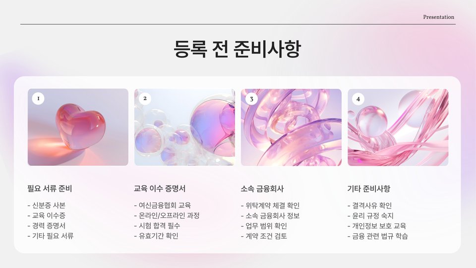 대출상담사 등록번호를 신청하기 위해서는 몇 가지 필수 조건을 충족해야 합니다. 먼저, 관련 교육 과정을 이수해야 하며, 교육기관에서 발급하는 수료증이 필요합니다. 이후, 등록신청서를 작성하여 관련 기관에 제출해야 하며, 필요 서류와 함께 제출해야 합니다. 이 과정에서 요구되는 서류는 본인의 신분증, 수료증, 그리고 기타 관련 서류들입니다.