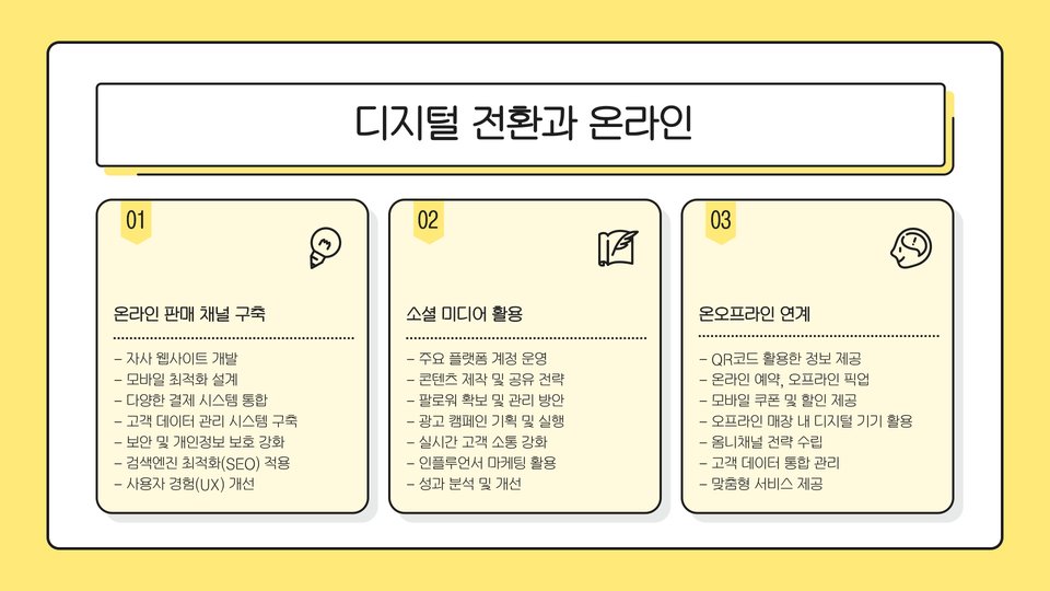 세 번째 포인트는 비즈니스 모델 혁신입니다. 기존의 비즈니스 모델에 안주하지 않고, 새로운 서비스나 상품을 지속적으로 개발해야 합니다. 고객의 변화하는 수요를 반영하고, 트렌드를 반영하는 것이 필요합니다. 예를 들어, 코비드-19 상황으로 인해 비대면 거래가 증가함에 따라, 소상공인들도 온라인 플랫폼을 통한 판매 방안을 고려해야 합니다.