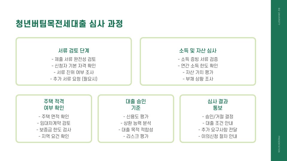 청년버팀목전세대출은 신청 절차가 비교적 간단하여 신청 후 빠르게 대출을 받을 수 있는 장점이 있습니다. 대출 신청은 주택금융공사 홈페이지에서 온라인으로 가능하며, 필요한 서류를 제출한 후 검토를 거쳐 승인 여부가 결정됩니다. 신청 서류로는 신분증, 소득증명서, 자산조회서 등이 필요합니다.