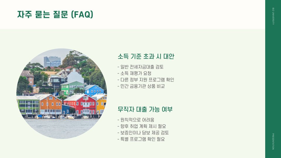 지금까지 청년버팀목전세대출의 소득 조건과 바로 가입하기 가능 여부에 대해 알아보았습니다. 청년들이 보다 나은 주거 환경을 가질 수 있도록 돕기 위해 여러 가지 조건들이 마련되어 있음을 이해하는 것이 중요합니다. 필요 시 주택금융공사나 관련 기관에 문의하여 자세한 정보를 확인하는 것이 좋습니다.