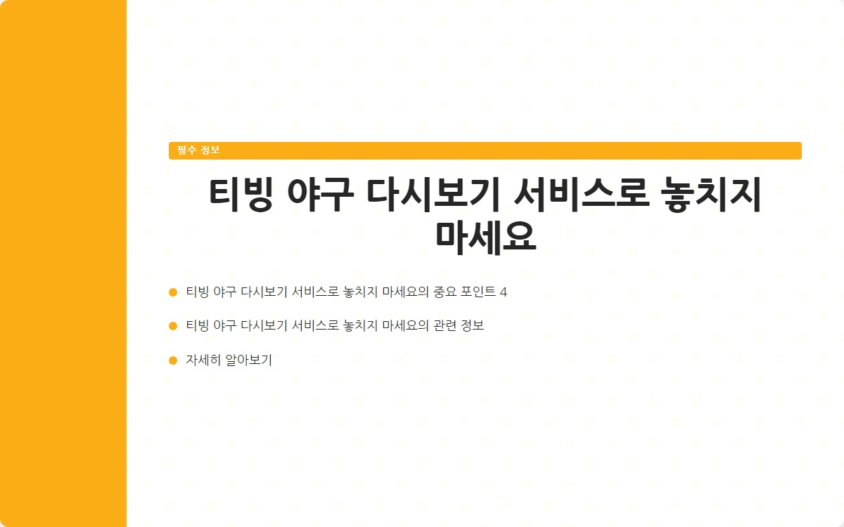 야구 팬이라면 놓칠 수 없는 순간들이 많습니다. 특히 가을야구 시즌은 그 어느 때보다도 긴장감 넘치는 경기들이 펼쳐지는데요, 원하는 경기를 놓쳤다면 얼마나 아쉬울까요? 이제는 그런 걱정 없이 티빙에서 야구 다시보기 서비스를 통해 모든 경기를 다시 관람할 수 있습니다. 궁금하시죠?