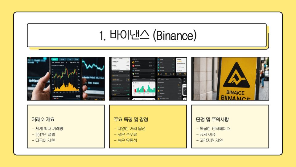 Binance는 세계에서 가장 큰 암호화폐 거래소 중 하나로, 다양한 암호화폐를 지원하며, 뛰어난 유동성과 낮은 수수료로 유명합니다. 사용자 인터페이스가 직관적이어서 초보자도 쉽게 사용할 수 있습니다. 또한, 모바일 앱을 통해 언제 어디서나 거래할 수 있는 장점이 있습니다.
